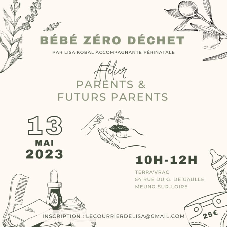 13 Mai atelier Bébé zéro déchet Un bébé au naturel, et pourquoi pas ? L’atelier « Bébé Zéro déchet » a pour objectif de vous transmettre des outils qui préservent la santé de votre enfant, qui soient faciles à mettre en place, en plus d’être économiques et écologiques ! Nous abordons les couches jetables/lavables, les…